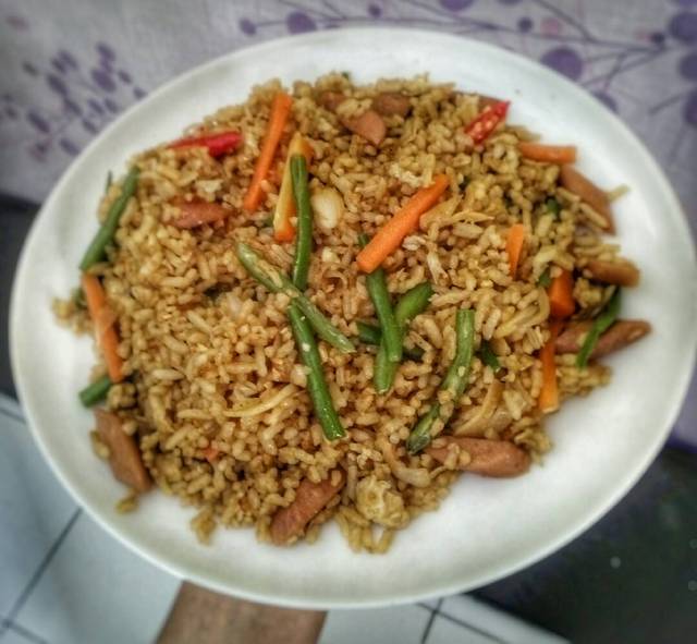 - Panas kan minyak secukupnya da margarin biar gurih" gmn gtuuu,lalu masukan bumbu goreng setmateng, udh wangi masukan sosis aduk sebentar lalu masukkan telor aduk sebentar lalu masukan sayurannya,,,udh sedikit layu masukan deh nasi dan kecap (bango) saos (abc),penyedap rasa (masako) aduk2 sampe rata cek rasa sesuai selera yaaa,,